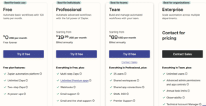 The Free plan provides a starting point with 100 tasks per month and single-step Zaps. This tier allows new users to explore basic functionality without financial commitment.