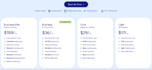 Wix pricing follows a straightforward subscription model. Plans range from $16 to $59 per month (billed annually) with clear features and limitations for each tier.