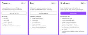 Jasper AI structures its pricing around premium features and capabilities. The platform starts at $49/month for unlimited words with a 7-day free trial, positioning itself as a premium content solution.